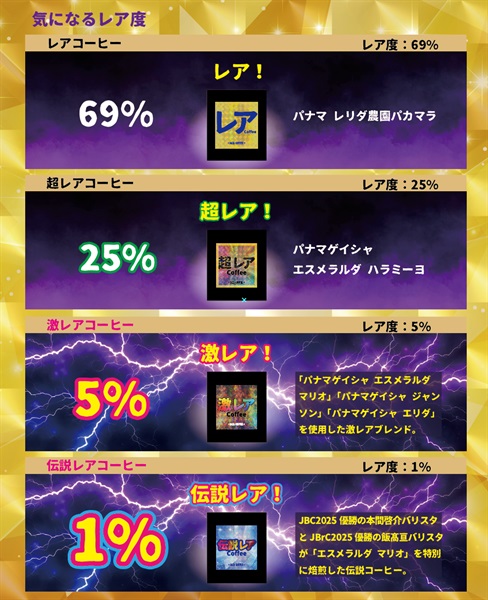 • 伝説レア(1%):JBC2025優勝の本間バリスタ・JBrC2025優勝の飯髙バリスタが特別に焙煎したエスメラルダ マリオ